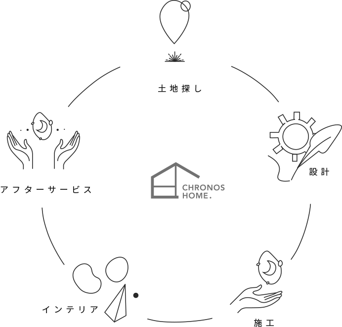 クロノスホームを選んでいただいたからには、そんな思いはさせたくありません。理想のお家をトータルでサポートして、お引渡し後は家具も植物もコーディネートされた心地よいお家で暮らしてほしいという思いから、全棟家具付きというスタイルが生まれました。